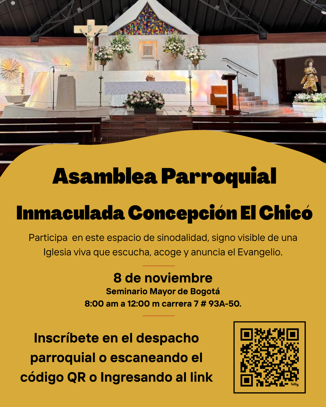 Querida comunidad de fieles: Con alegría y espíritu de comunión, les invitamos a participar en nuestra Asamblea Parroquial, un espacio de sinodalidad, encuentro, reflexión y discernimiento comunitario, donde juntos renovaremos nuestro compromiso de ser una Iglesia viva y misionera.