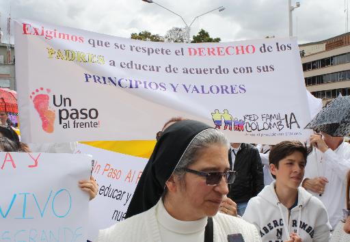 Vestidos de blanco, con pancartas, bombas, manillas, letreros, pitos y ante todo de manera pacífica y respetuosa, miles de colombianos marcharon pidiendo en unísona voz el respeto por el derecho de educar a los hijos con valores éticos y morales.