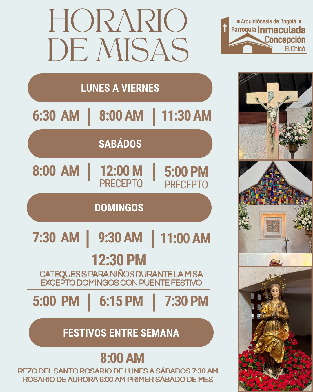 Información de los horarios de las eucaristías.Carrera 11 con calle 88 - Bogotá #SantaMisa#Oración #Inmaculada#InmaculadaConcepción Like 0 Dislike 0