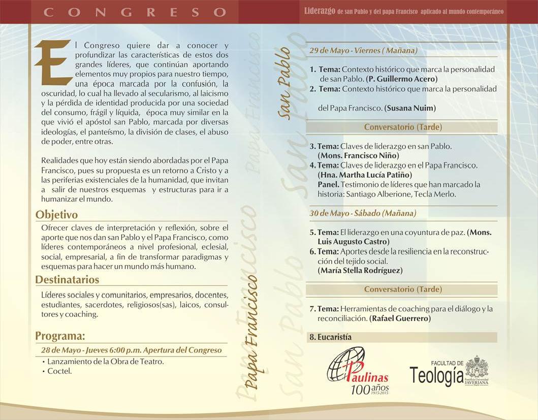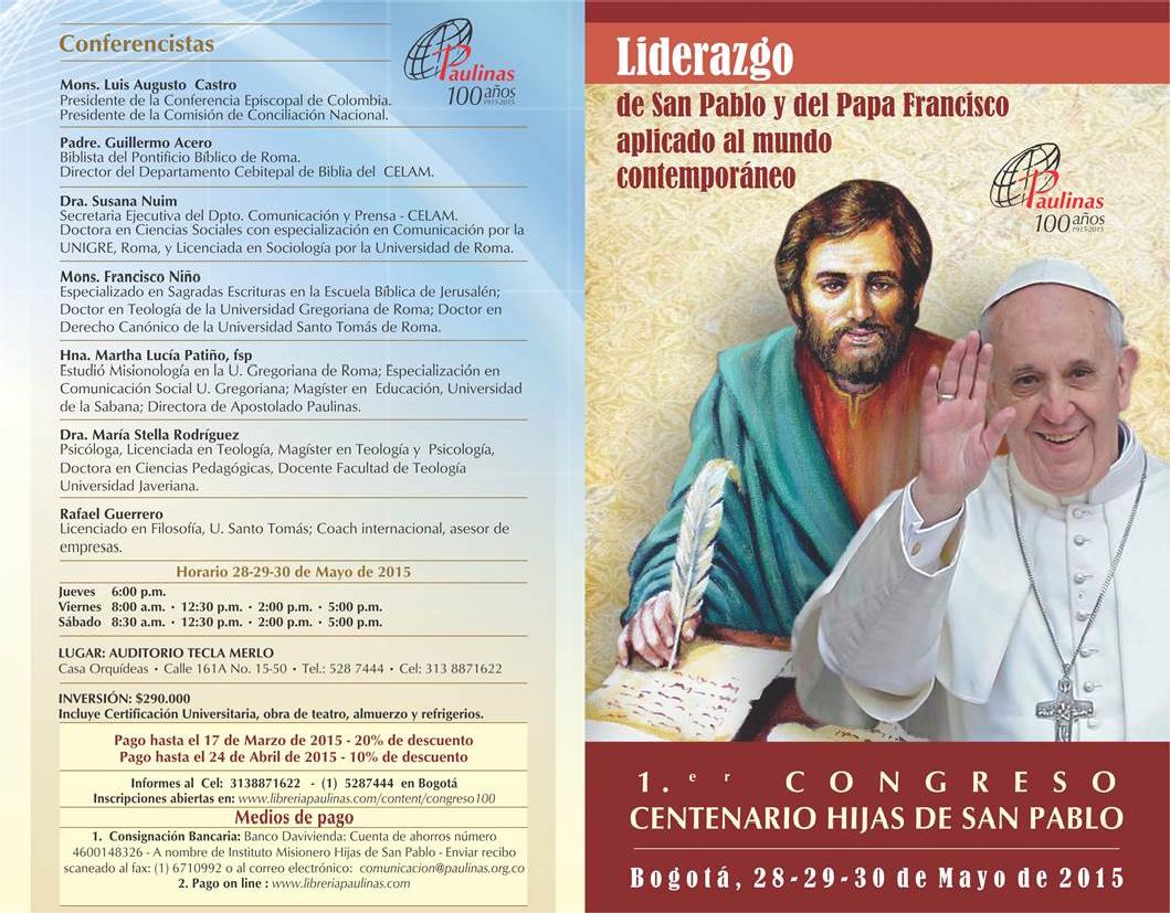 Centro de información Yo quiero Noticias Boletines Eventos Artículos Canonización Mensajes del Señor Cardenal Cartas pastorales Homilías Mensajes La voz del pastor Documentos del Vaticano NoticiasPrimer Congreso: Liderazgo de San Pablo y del Papa Francisco aplicado al mundo contemporaneo27 de Mayo de 2015Para mayor información haz clink en el siguiente link: http://libreriapaulinas.com/congreso Like 0 Dislike 0 Noticias relacionadas 🙏🏻 ✝️ Del 29 de marzo al 5 de abril Nuestra fidelidad genera futuro ¡Feliz cumpleaños!