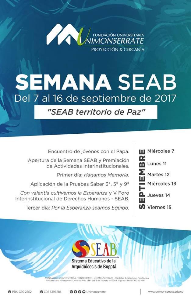 Centro de información Yo quiero Noticias Boletines Eventos Artículos Canonización Mensajes del Señor Cardenal Cartas pastorales Homilías Mensajes La voz del pastor Documentos del Vaticano NoticiasProgramación de la semana del SEAB 201712 de Septiembre de 2017Del 7 al 16 de septiembre de 2017 se realizará en los colegios del sistema educativo arquidiocesano, la semana del SEAB, teniendo como temática principal “SEAB un… Like 0 Dislike 0 Noticias relacionadas Archivo del Plan de Predicación - 2024-2025 Tiempo para nutrir, cuidar y testimoniar la fe La Arquidiócesis de Bogotá celebró la ordenación de nuevos sacerdotes y diáconos