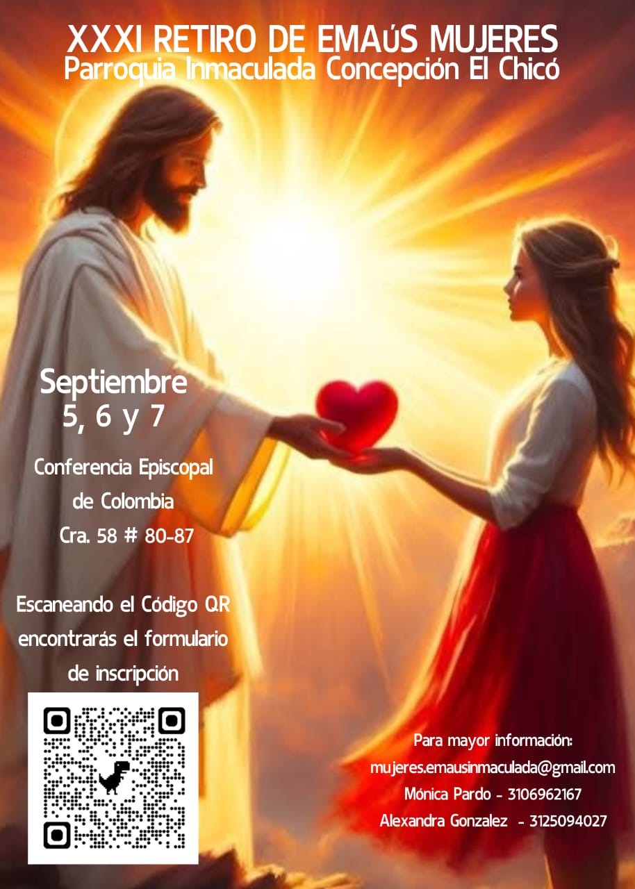 NoticiasRETIRO ESPIRITUAL5 de Agosto de 2025EMAÚS MUJERES La Parroquia Inmaculada Concepción El Chicó te invita al retiro espiritual de Emaús mujeres, el 5, 6 y 7 de septiembre de 2025. Mayores informes: 3106962167 - 3125094027 5, 6 y 7 de septiembre de 2025. Conferencia Episcopal de Colombia Cra 58 80-87Inscripciones en el link o escaneando el codigo qr.https://docs.google.com/.../1WA1AIf4OkZHDNFUqKfUtrGL.../edit#Emaús #Mujeres#Oración #Inmaculada#InmaculadaConcepción Like 0 Dislike 0